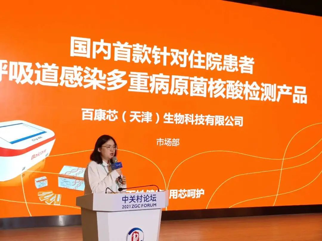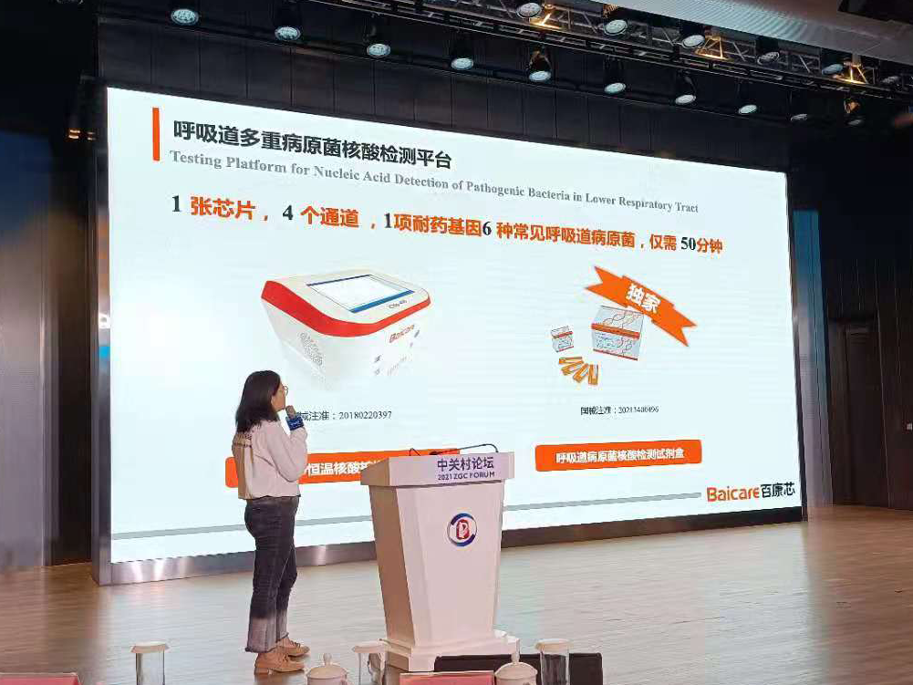 中關(guān)村論壇國際技術(shù)交易大會(新技術(shù)新產(chǎn)品首發(fā)與推薦大會)上,百康芯市場總監(jiān)白雅麗女士帶來了《國內(nèi)首款針對住院患者的呼吸道多病原核酸檢測產(chǎn)品》報告,詳細(xì)講述了該產(chǎn)品可實現(xiàn)一次加樣多指標(biāo)并行檢測,以更加簡捷的方法和更短的檢測時間對多種病原體進(jìn)行檢測、分析和報告。為臨床醫(yī)生提供快速而準(zhǔn)確的檢測結(jié)果,減少病人等待的窗口期和治療周期,為臨床經(jīng)驗用藥提供科學(xué)依據(jù)。